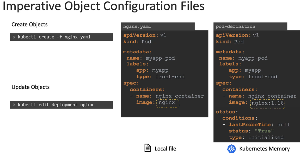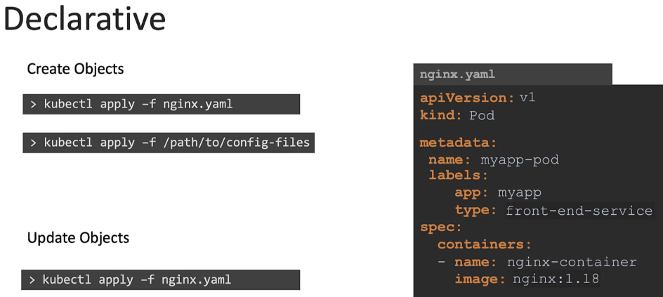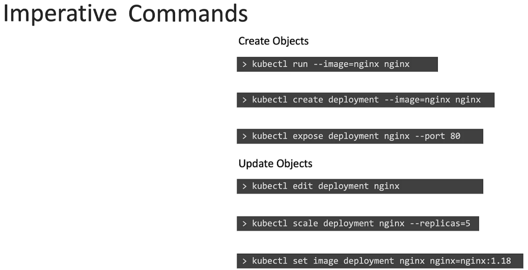 - 예: 파드 또는 배포를 빠르게 생성할 때 명령형 명령어 사용.