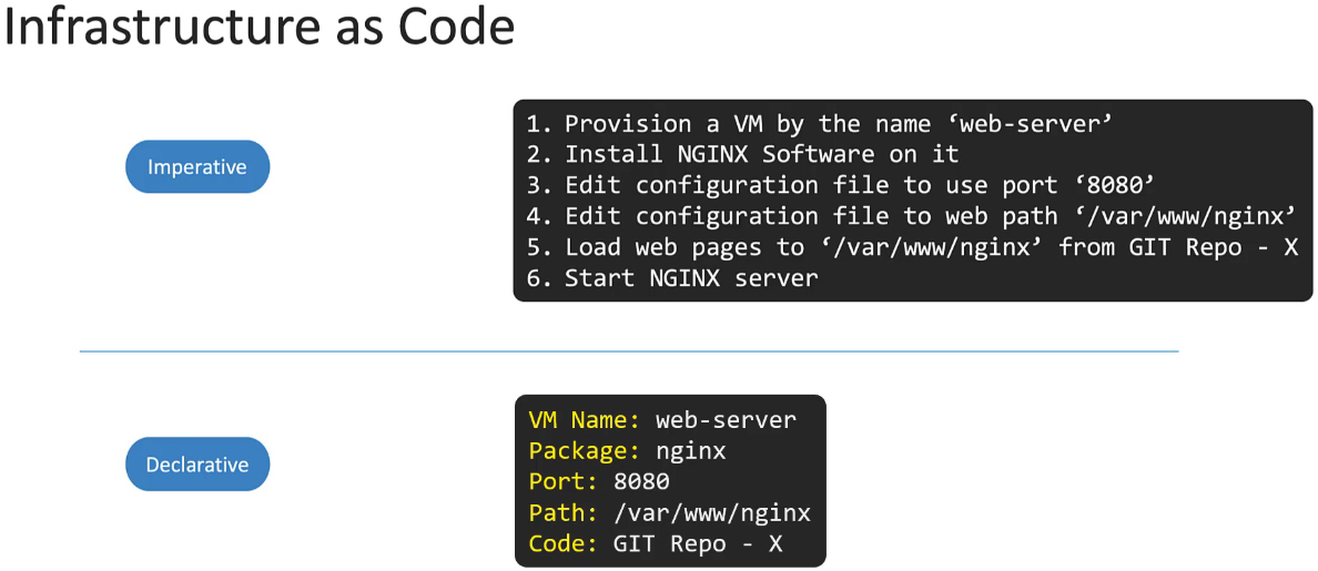 - 예: VM을 프로비저닝하고, NGINX를 설치하고, 설정 파일을 편집하고,