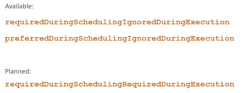 - 현재 사용 가능한 Node Affinity 타입은 ignored during execution 값을 가짐.